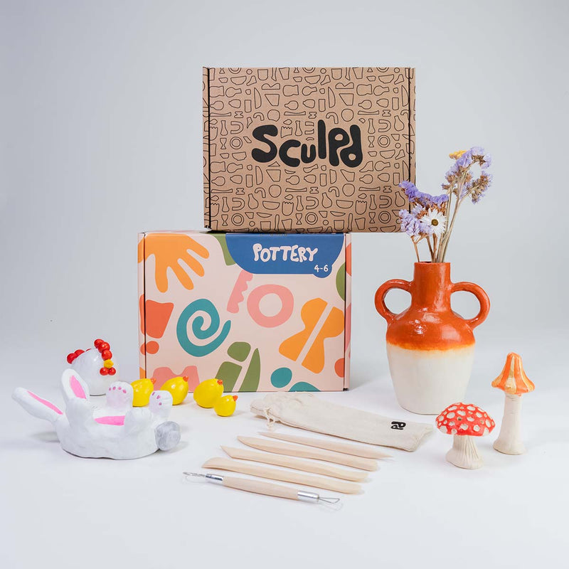 This bundle come with both our best selling Sculpd Pottery Kit, and a Kids Ultimate Pottery Kit (for ages 4-6 or 7-9). Inside you'll find age specific pottery guides with lots of inspiration and step-by-step instructions for crafting hand-built pottery from home.